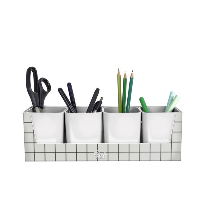 O kit Minimal vem com 4 porta objetos brancos em uma base estampada no estilo Japandi, atual tendência de xadrez que une o minimalismo japonês com o conforto dinamarquês.