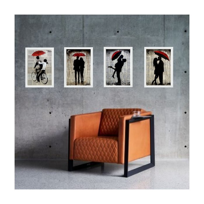 Kit 4 Quadros Casal Sombrinha Vermelha 24x18cm:madeira Preta Preta
