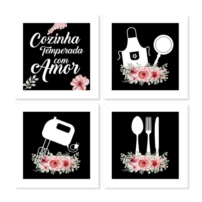 Kit 4 Quadros Decorativos Decoração Cozinha Cozinha Temperada com Amor Quero Mais Quadros KC4E PRETO