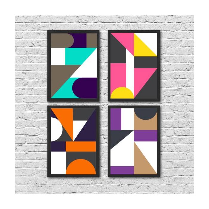 Kit 4 Quadros Geométricos Pantone 45x34cm - com vidro:Madeira preta