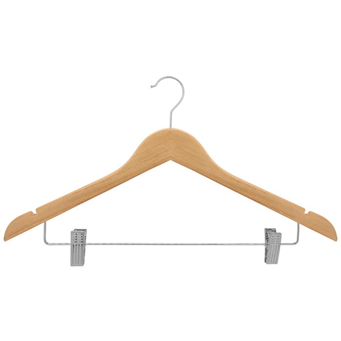 Cabide de Madeira Marfim Revestido de Verniz para roupas pesadas possui gancho em aço com acabamento cromado.