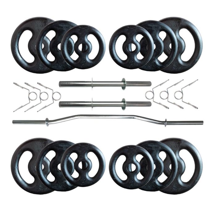 04(quatro) anilhas de ferro fundido pintado de 5 Kg; Exercitar-se é um excelente remédio para o corpo e para a alma. As academias estão cada dia mais lotadas; são homens e mulheres em busca do corpo perfeito ou simplesmente em busca de saúde e bem estar. Mas é preciso que elas estejam equipadas e bem preparadas para receberem os seus alunos e o kit com anilhas de ferro fundido e barras com presilhas é uma excelente opção para equipar a sua academia com produtos de qualidade. O kit também é ideal para você que gosta de malhar em casa com todo o conforto e comodidade, pois vem com um conjunto completo de pesos marcados e identificados para ajudar na correta execução de seus exercícios.