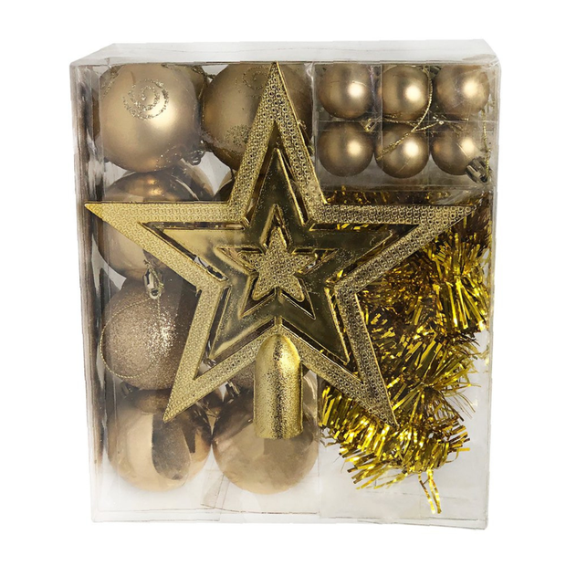 Para quem ama enfeitar a árvore e toda a casa, esse kit com bolinhas será a escolha perfeita para esse natal! Com um design clássico, conta com 44 unidades de diferentes itens, com formas, texturas, tamanhos e tonalidades variadas como, corações, pinhas, bolas com glitter, entre outras, proporcionando diversas combinações, podendo ser usado em diversas decorações natalinas, como guirlandas, arranjos, centros de mesa e muito mais, dando um toque festivo e sofisticado ao seu ambiente. Cada uma delas contém uma cordinha em seu topo para que possa amarrá-la e pendura-la, trazendo ainda mais facilidade na hora da decoração. Feitas com materiais de alta qualidade, as bolinhas são resistentes e duráveis, podendo ser reutilizadas em várias celebrações natalinas, além de seu tamanho compacto que as torna ideais para árvores de natal de todos os tamanhos. O kit conta com: -02 Cordões de Pérolas Dourado; -01 Festão dourado; -01 Estrela Dourada; -04 Bolas de 6cm com Espirais; -08 Bolas de 6cm Metalizada; -04 Bolas de 6cm com Glitter; -12 Bolas de 2,5cm Fosca; -12 Bolas de 2,5cm Metalizada. ESPECIFICAÇÕES: Material: PVC Dimensão: -Estrela: Larg.: 19cm x Alt.: 19cm -Bolas Maiores: Diâmetro: 6cm x Volta completa: 19,5cm -Bolas Menores: Diâmetro 2,5cm x Volta Completa: 9,5cm -Festão: Comprimento: 2,8m -Cordão de Pérola: 4,04M Peso: Kit Aprox. 400g CONTÉM: 01 KIT ENFEITES DE NATAL COM BOLAS CORDÃO DE PÉROLAS E ESTRELA - DOURADO
