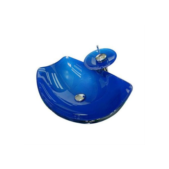 Dimensões:46,5x31x13,2cm, cor:azul, espessura:12mm, material:vidro temperado, kit 4pçs-cuba canoa chanfrada oval+valvula click+sifão+torneira cascata