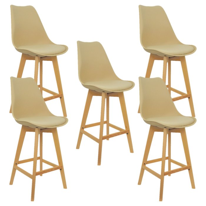 Kit 5 Banquetas Monty Leda Luisa Saarinen Alta Base Fixa Madeira Bege