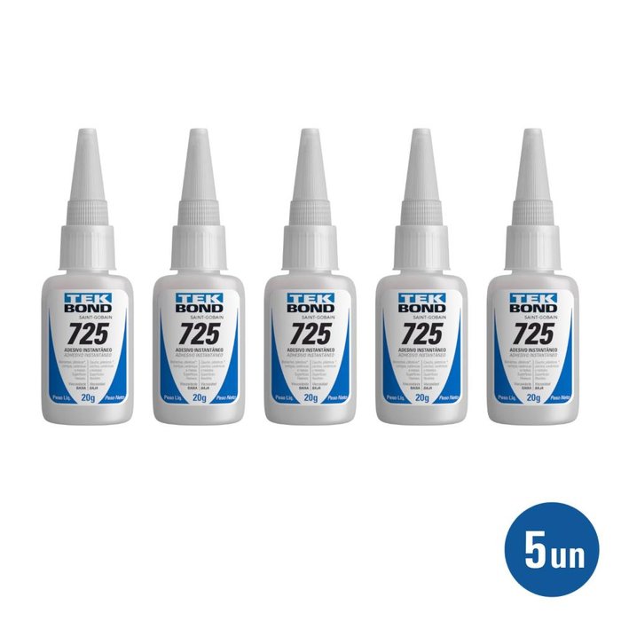 Contém 5 unidades da Cola Instantânea 725 20g - Baixa Viscosidade. Adesivo de baixa viscosidade (mais líquido) e fixação extremamente rápida. Ideal para superfícies lisas (não porosas), tanto flexíveis quanto rígidas. Se o seu objetivo é colar superfícies lisas (flexíveis ou rígidas) com uma fixação extremamente rápida, então o produto que você procura é o Adesivo Instantâneo 725 da Tekbond. É o tipo de produto que é bom a gente ter em casa para consertar brinquedos, utensílios de cozinha, ferramentas e colar solados e saltos de calçados. É também muito usado por quem curte modelismo, para colagem de miniaturas e maquetes. Outra possibilidade de uso: colagem de componentes eletrônicos como cabos e fios. É a cola perfeita para quem tem pressa na execução dos trabalhos e acredita que aqueles segundos a mais esperando fixar são tempo perdido. Pessoas proativas, que não abrem mão de uma máxima resistência e qualidade. Para quem produz bijuterias e acessórios, por exemplo, é a melhor escolha para fixar pedras e metais. A Cola Instantânea 725 da Tekbond adere em uma ampla variedade de metais, plásticos, borrachas, cortiças e cerâmicas. Por ter consistência bem líquida, ele é muito usado em fissuras, porque penetra e preenche facilmente os espaços.Com ele é pingou colou! Características e benefícios Baixa viscosidade (mais líquido) Fixação extremamente rápida Ideal para materiais lisos, não porosos Adere em uma ampla variedade de metais, plásticos, borrachas, cortiças e cerâmicas Simples de usar e muito resistente Colagem extraforte e com alta durabilidade É multiuso, transparente e ideal para materiais flexíveis Modo de uso As superfícies devem estar limpas, sem resquícios de óleo e sujeira. Aplique uma fina camada de cola em apenas um dos substratos a serem fixados (o excesso prejudica o desempenho do produto). Após a aplicação, mantenha as peças pressionadas por aproximadamente 20 segundos (quando a resistência inicial estará concluída).