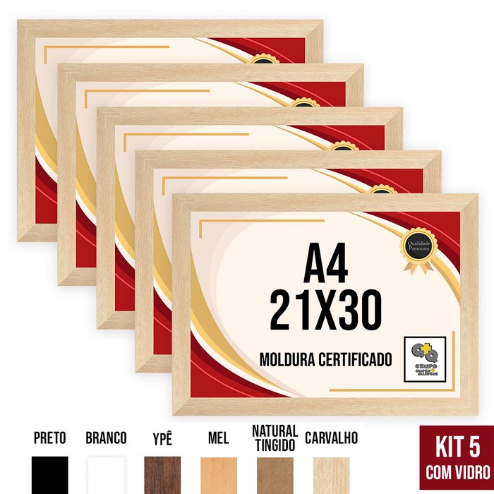 Kit 5 Molduras Porta Certificado Diploma Foto A4 21x30 com Vidro - Carvalho - Liso