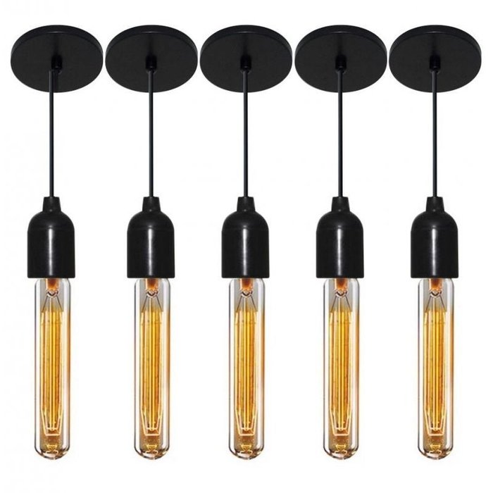 Especificação: Marca: Vivare Brasil Kit/5 Pendente Luminaria Retro Md-4149 Suporte Para Lampada / Não Inclusa Material: Estrutura em Aço e Alumínio, Pintura Eletrostática Alta Resistência Resistente: Á Maresia, Garantia 1 Ano Após Recebimento Tensão: 110/220v Bivolt Utiliza: 1 Lâmpada LED Até 16w ou Eletrônica Até 25w ou Filamento de Carbono Até 60w Cada - Não Acompanha Lâmpada Soquete: Rosca E-27 Cabo Regulável: 1,85 Metros + Prensa Cabo Utilização: Uso interno ou área coberta: varanda, sala de estar, sala de jantar, suíte, quartos, corredor, hall, mezanino, escadas, churrasqueira, lareira, área de circulação, lojas, comércios. Fixação: Em Teto de gesso, forro de pvc, forro madeira, reboco, alvenaria, tijolo