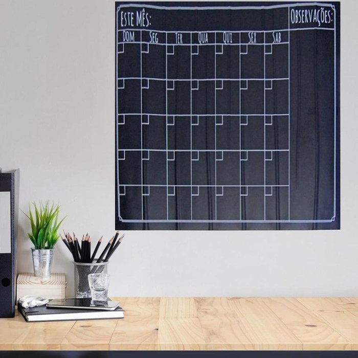 KIT 5 PLANNER QUADRO DE PLANEJAMENTO MENSAL PARA RECADOS LISTA DE COMPRAS AUTOCOLANTE Superfícies recomendadas: Aplicar em superfícies lisas,sem textura ou infiltrações. Maiores informações no manual de aplicação que acompanha o produto.Ambientes recomendados: QuartoÉ adequado para pared: SimÉ adequado para carro: NãoÉ aplicável para geladeira: NãoÉ lousa: SimAdesivo de Parede Lousa Calendário Para as crianças soltarem a imaginação, para recados, lembretes, lista de afazeres, e muitas outras finalidades, foi para isso que pensamos nesta Lousa Adesiva Calendário. Pode ser utilizado com giz comum e é facilmente apagável. Pode ser colocado no quarto dos pequenos, na sala de estudos dos mais crescidinhos, no escritório, na salinha de brinquedos, ou em muitos outros lugares. É super versátil, e combina com tudo. Garanta hoje esse adesivo e decore com praticidade. Dimensões44x60 cm Características.Lavável..Produto não tóxico. O recorte inteligente dos nossos adesivos possui alta precisão e facilita a aplicação. Você mesmo pode aplicar, sem necessidade da contratação de um profissional. Onde posso Aplicar meu Adesivo?Superfícies e paredes lisas, com tinta acetinada, latex e acrílica, livres de poeira ou pó de gesso, móveis, espelhos, portas, box de banheiro. Não aplicar sobre tinta fresca, tinta magnética, superfícies irregulares ou texturizadas, locais com infiltrações. Limpeza Nossos adesivos são laváveis e resistentes a todos os produtos de limpeza de uso doméstico, exceto os produtos à base de cloro