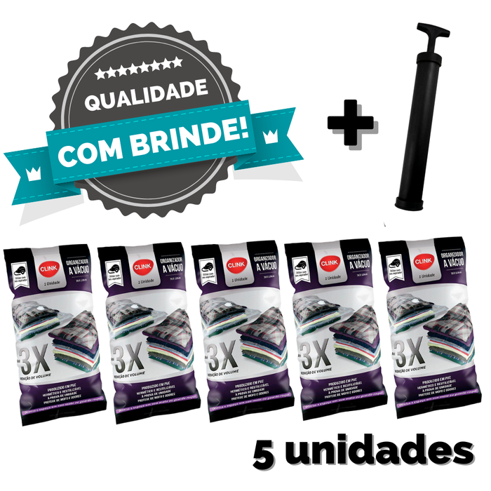 Os Sacos a Vácuo de Plástico da Clink são perfeitos para organizar suas roupas, cobertores, toalhas, etc de forma prática, segura e MUITO COMPACTA. O ganho de espaço é incrível, chegando a reduzir em até 3x! Seu modo de usar e muito fácil e prático. Você precisa apenas dobrar suas roupas, colocar dentro do saco plástico e apertá-lo bem para retirar o ar interior. Caso queira, pode acoplar aspirador de pó ou mesmo uma bomba de sucção. Ele é produzido em PVC, é reutilizável, resistente e totalmente hermético ***É a prova de umidade, protege de mofo, fungos, insetos e odores indesejáveis! Características do Produto Material: Plástico Cor: Transparente Dimensões: 60cm x 80cm Contém: 5 - Organizadores a Vácuo - 60x80cm - Clink 1 - Brinde Bomba de Ar Plástico - Preta - 4x28cm - Clink