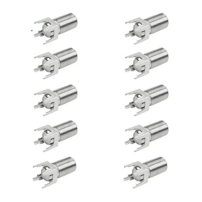 Este kit contém 50 conectores F fêmea com rosca, projetados para montagem em placas de circuito impresso (PCI) com solda direta. Com ângulo de 180°, são ideais para aplicações em sistemas de TV, RF, antenas e projetos eletrônicos diversos.