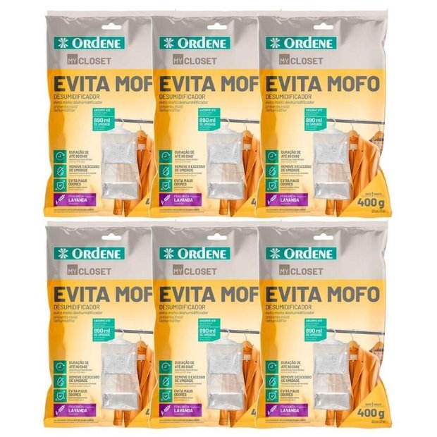 Mantenha seus armários, guarda roupas e closets sempre protegidos da umidade com o kit de 6 antimofos Ordene linha My Closet. Cada unidade possui 400g de agente desumidificante que atua de forma eficiente na absorção da umidade do ar, ajudando a evitar mofo, bolor, mau cheiro e manchas em roupas, calçados e acessórios. Com fragrância suave de lavanda, oferece uma dupla ação: protege e perfuma o ambiente ao mesmo tempo. É ideal para espaços fechados e pouco ventilados, prevenindo danos causados pela umidade excessiva, especialmente em regiões mais úmidas. Praticidade, segurança e frescor em um só produto.