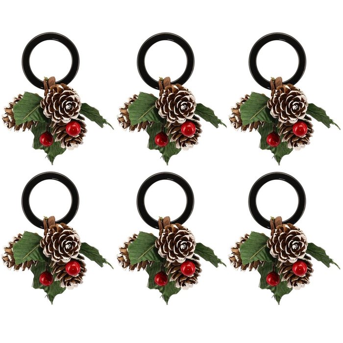 Kit 6 Argolas Decoradas Porta Guardanapo Natalino Pinhas e Berries - Magizi