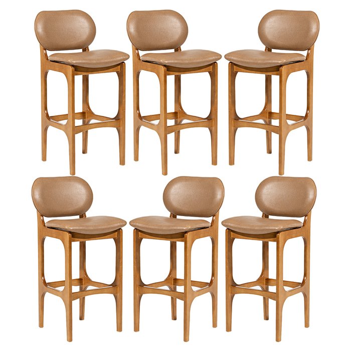 Kit 6 Banquetas Alta Estofada Rafine Madeira Castanho Tecido Impermeável Marrom