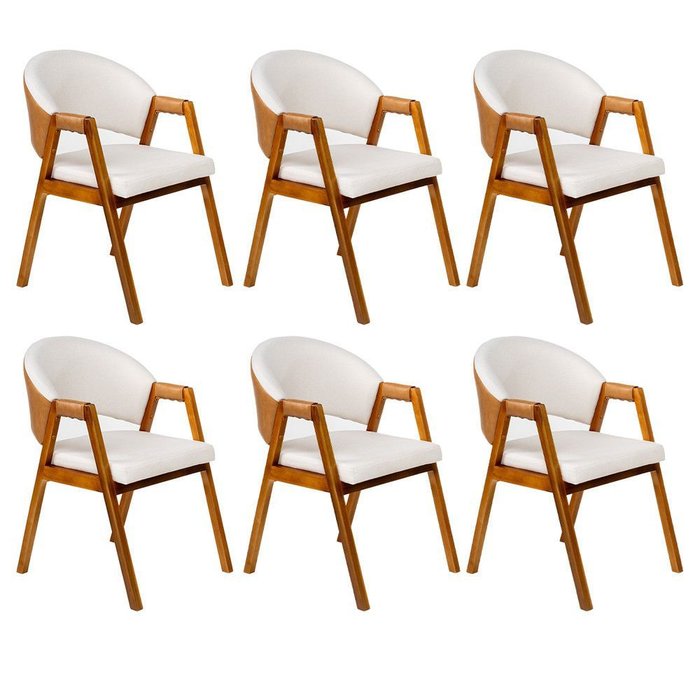 Kit 6 Cadeiras Sala de Jantar Premium com Braço Madeira Maciça Movellu Home Linho Bege/Corino Marrom