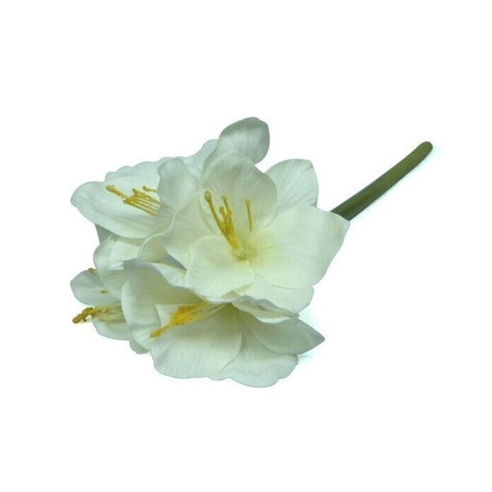 O galho de flor artificial amarílis, ostenta hastes grossas que suportam 4 flores vibrantes na cor branca. Use flores artificiais para iluminar sua decoração.