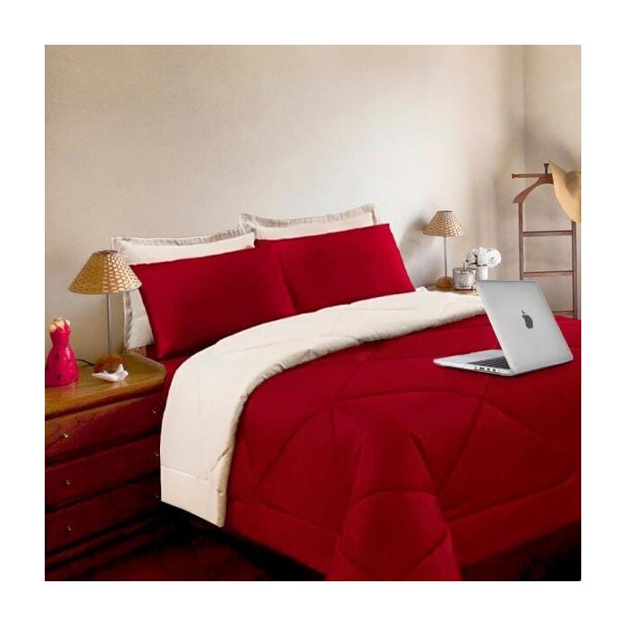 Kit 6 Pçs com Edredom e Lençol Aconchego Casa Dona Dupla Face Casal Queen Vermelho e Palha