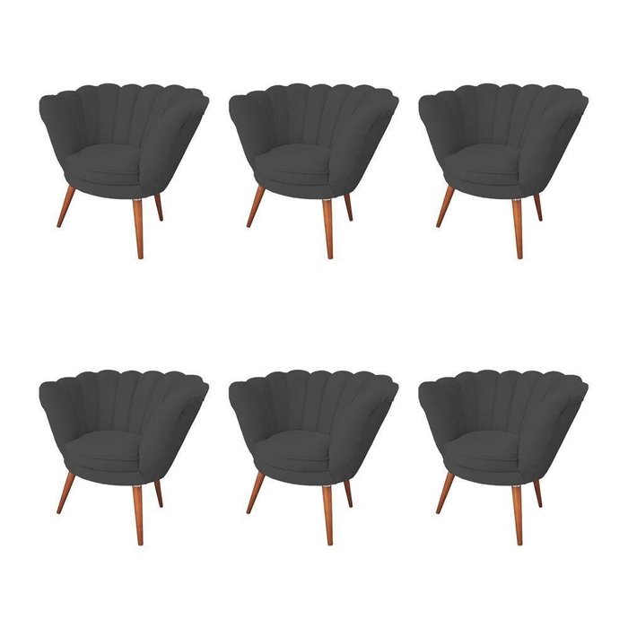 Kit 6 Poltronas Decorativa Pétala Clínicas E Base Madeira Maciça Estofado Veludo Grafite - Cinza