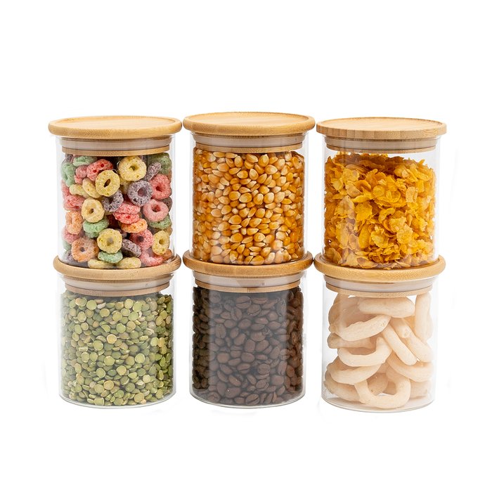 Kit 6 Potes de Vidro Empilhável Hermético Tampa Bambu 400ml
