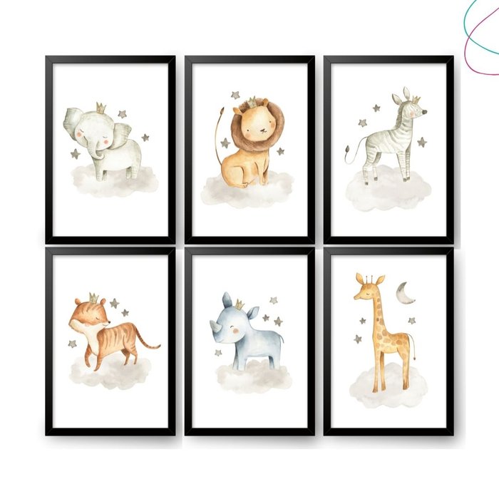kit 6 Quadros Decoração Quarto Infantil Safari Baby Aquarela:Preta
