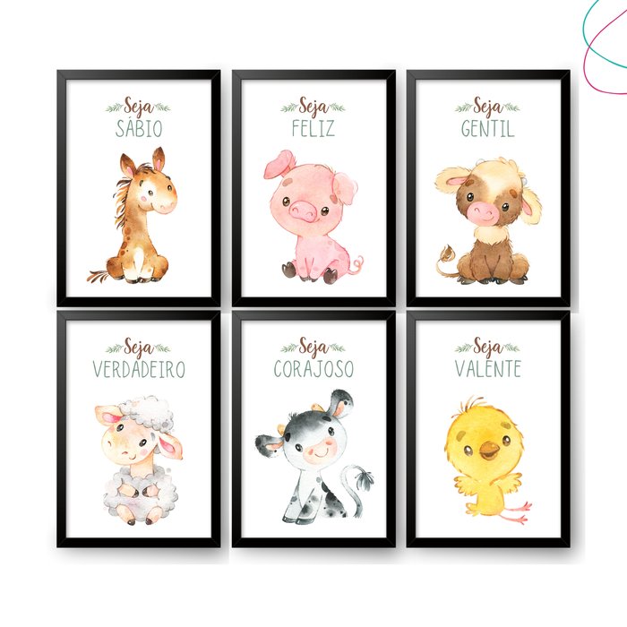 Kit 6 Quadros Decorativos moldura e vidro Animais da Fazenda:Preta