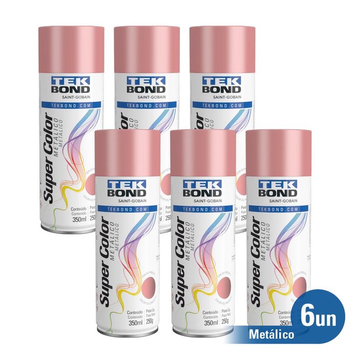 O kit contém 6 unidades de Tinta Spray Rosa Milennial Metálico.Tinta acrílica desenvolvida com alta tecnologia para um perfeito aspecto metálico em artesanatos, madeiras, cerâmicas, decorações internas e metais. A tinta spray Super Color Metálico da Tekbond impressiona pela variedade. São treze cores incríveis: prata, azul, cromado, dourado, vermelho, cobre, preto, verde, bronze, ouro, rose gold, rose millennial e cobre rose. É o produto perfeito para dar aspecto metálico em móveis, jarros, louça, peças artesanais etc. Você pode aplicar a tinta spray em madeiras, cerâmicas, decorações internas e muito mais! Por serem materiais livres de oxidação, ferrugem e corrosão, você terá apenas a parte boa: a beleza! Afinal, o acabamento metálico chama atenção pelo brilho, que agrega elegância e sofisticação. E um detalhe importante: a tinta spray também pode ser aplicada em metais! É um excelente recurso para deixar objetos antigos com cara de novos, além de oferecer uma camada extra de proteção às peças. Com a tinta spray Super Color Metálico da Tekbond, tudo fica com um efeito extraordinário! Características e benefícios Tinta acrílica desenvolvida com tecnologia de ponta; Ideal para artesanatos, madeiras, cerâmicas, decorações internas e metais; Perfeito aspecto metálico que agrega elegância e sofisticação; Prática de usar. Modo de uso Remova vestígios de pintura antiga, ferrugem, gordura e poeira. Proteja as partes que não serão pintadas com papel, papelão ou plástico. Para aplicações em metais (ferrosos e não ferrosos) com ou sem oxidação, aplique o Primer Spray Super Color Uso Geral. Espere secar e lixe com lixa d’água 400 para deixar a superfície bem lisa. Agite bem a lata antes do uso e entre as demãos. Se a válvula entupir, retire e mergulhe o bico em thinner ou acetona. Se for preciso, desobstrua o orifício com uma agulha. Aplique de 2 a 3 demãos (camadas) para obter uma pintura uniforme e bonita. Na primeira vez, aplique uma fina quantidade de tinta como base para as outras demãos. Entre cada demão de tinta, aguarde 4 a 9 minutos. Para tocar, aguarde 30 minutos. Para manuseio da peça, aguarde 3 horas. O produto leva para atingir a máxima resistência. Para testes mecânicos, a recomendação é esperar.