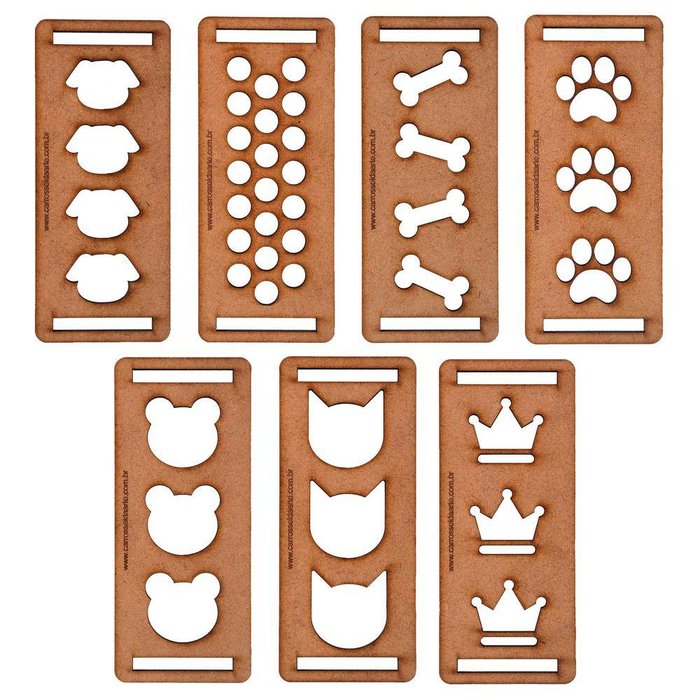 Kit 7 Réguas Vazada Para LaçoKit 7 Réguas Vazada para Laço Kit composto por 7 réguas vazadas para laço Régua para fitas nº 9 ou 38cm. Utilize pirografo ou ferro de solda com a ponta bem fina. Tamanho: 5x13cm Marca: Carrossel da Arte Material: MDF Espessura: 3 mm Régua cortada a laser