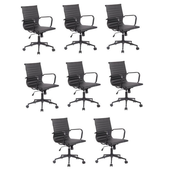 Conjunto de 8 Cadeiras de escritório com estrutura em aço pintado à pó, revestimento em poliuretano (PU), com encosto baixo. Possui base giratória em aço pintado à pó e rodízios em nylon. Possui ajuste de altura (mínimo 89cm e máximo 98cm) e sistema relax.