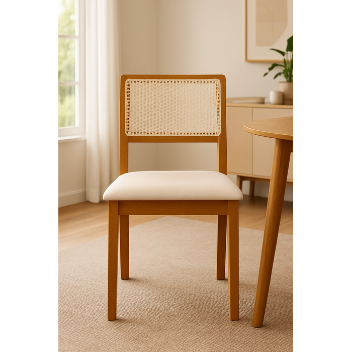 Kit 8 Cadeiras de Jantar Luxo Madeira Maciça Mel Encosto Telinha Palha Estofada Veludo Bege Rubi