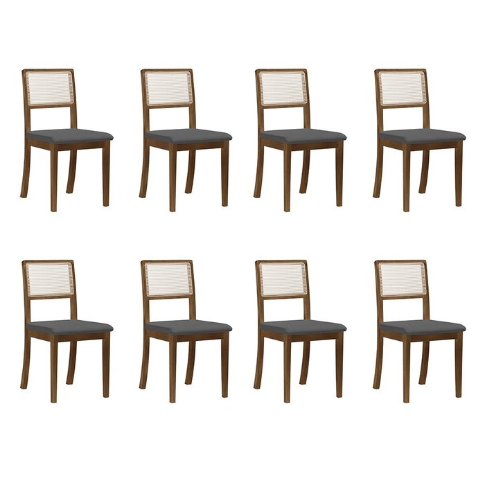 Kit 8 Cadeiras de Jantar Palha Estofada Linho Cinza com Tela Sextavada Rubi Madeira Maciça Imbuia Cinza