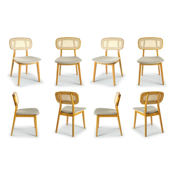 A estrutura da cadeira é feita em madeira maciça de Tauari, um tipo de madeira conhecida por sua durabilidade e resistência. Além disso, o acabamento da madeira passa por três processos de pintura e é finalizado com verniz PU (poliuretano), realçando a beleza natural da madeira e proporcionando proteção contra desgaste e manchas.