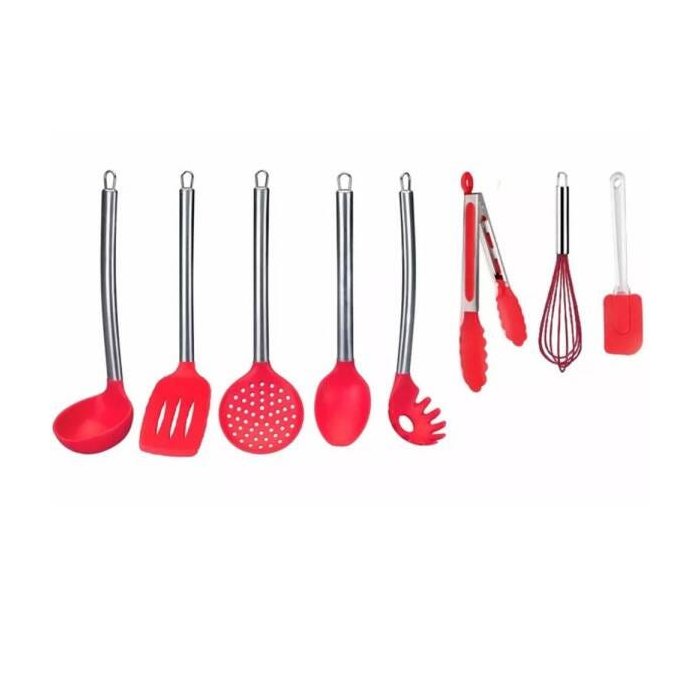 Kit 8 Colheres Utensílios Silicone Vermelho Cabo Inox