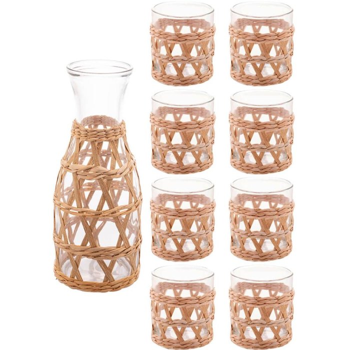 Kit 8 Copos Baixos 320ml Garrafa de Vidro 800ml Wolff Sisal Decorados para Mesa Posta Rústica