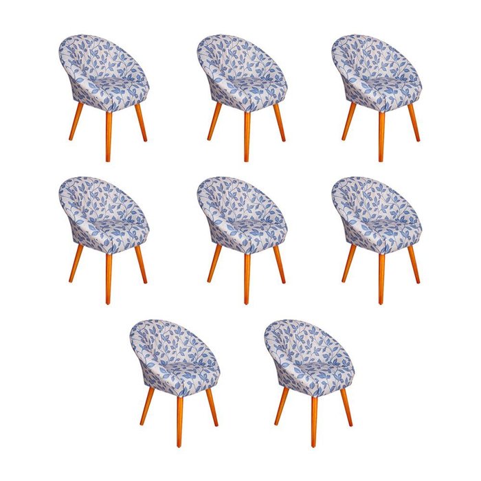 Kit 8 Poltronas Decorativa Canastra Estofada Veludo Floral Azul Pés em Madeira Maciça