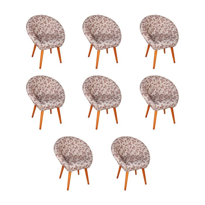 Kit 8 Poltronas Decorativa Canastra Estofada Veludo Floral Marrom Pés Palito em Madeira Maciça