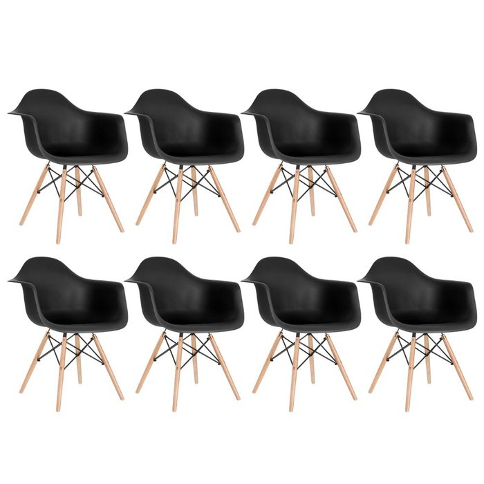 KIT - 8 x cadeiras Charles Eames Eiffel DAW com braços - Base de madeira clara - Preto