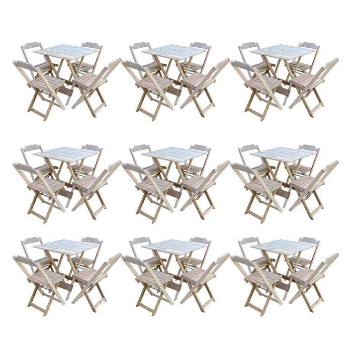 Kit 9 Conjuntos De Mesa Dobravel Com 4 Cadeiras De Madeira 70x70 Para Restaurante E Bar - Sem PinturaO produto é ideal para bares, restaurantes, estabelecimentos, áreas de lazer e também para sua casa. Feito em madeira maciça, tornando resistentes e duráveis. Seu design permite que seja encaixado em qualquer ambiente, trazendo um toque a mais para seu estabelecimento. Além de sua durabilidade, o que lhe trará conforto para servir seus clientes. Por ser dobrável torna-se mais fácil guardar, manusear e limpar o produto.Atenção: EVITE USAR PRODUTOS ABRASIVOS E QUÍMICOS PARA LIMPEZA DO PRODUTO, aconselha-se o uso de pano umedecido para melhor conservação; mantenha o produto fora de chuva e sol constantes.OBS: MDF ULTRATipo: Kit 9 Conjuntos de Mesa 4 Cadeiras Modelo: DobrávelCor: Crua Medidas Mesa:Altura: 76cmLargura: 70cmComprimento: 70cmMedidas Cadeiras:Altura: 80cmLargura: 45cmComprimento: 42cmOBS: Evite usar produtos abrasivos e químicos para limpeza do produto, aconselha-se o uso de pano umedecido para melhor conservação; mantenha o produto fora de chuva e sol constantes.ATENÇÃOIMAGENS MERAMENTE ILUSTRATIVAS REALIZADO EDIÇÃO, PODENDO HAVER UMA PEQUENA VARIAÇÃO DE COR DEPENDENDO DE CADA TELA OU MONITOR.Kit 9 Conjuntos de Mesa Dobravel com 4 Cadeiras de Madeira 70x70 para Restaurante e Bar - sem Pintur