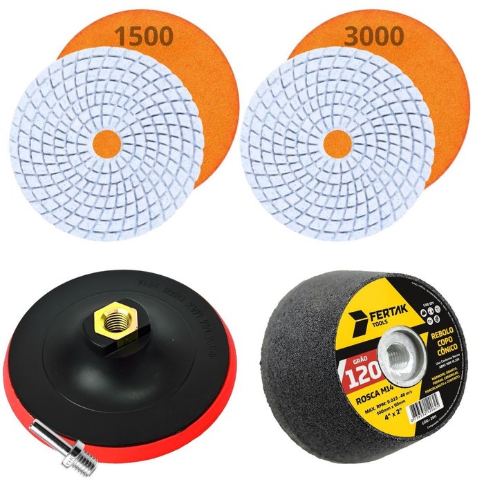Kit Acabamento Porcelanato com Suporte + Adaptador + Lixa Grão 1500 e 3000 + Rebolo Grão 120