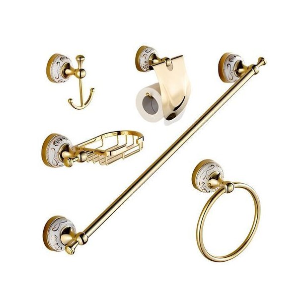 Kit Banheiro Dourado Porcelana Argola Toalheiro Suporte Luxo