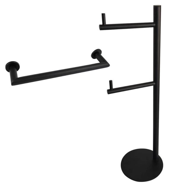Kit Acessórios Banheiro Inox Toalheiro 30cm Papeleira de Chão Porta Papel Higiênico Pretos.<br><br>Garantia: 90 dias / Peso: 862g / Cor predominante: Preto / Ref: 7798137682963<br>Dimensões do toalheiro: 30cm (C) x 6cm (L) x 2cm (A);<br>Diâmetro dos acabamentos: 4cm;<br>Distância entre parafusos: 28cm;<br>Comporta: 1 toalha de mão;<br>Dimensões da papeleira: 16cm (C) x 14cm (L) x 50,5cm (A);<br>Dimenção da base: 14cm (D);<br>Comprimento de cada haste: 14cm;<br>Comporta: 2 Rolos de papel higiênico;<br>Modelo do aço: tubular;<br>Material: aço inox pintado.<br><br>Limpeza e cuidados:<br>- Não lavar com materiais abrasivos;<br>- Recomenda-se a limpeza com pano macio e úmido, sabão neutro e água. Secar em seguida.<br><br>Que tal dar uma cara nova para a decoração de seu banheiro ou lavabo? Esse kit de acessórios para banheiro é ideal para quem quer unir beleza e praticidade. O porta papel higiênico é duplo, comportando até 2 rolos por vez. Já o toalheiro de parede deixará a toalha ao seu alcance. Produzidos em aço inox de excelente qualidade, por isso são muito resistentes e podem ser utilizados inclusive em regiões litorâneas. Os metais sanitários possuem design inovador, com acabamento em cor preto fosco, agregando em seu ambiente com sofisticação.