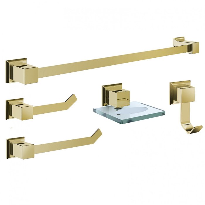O kit de acessórios para banheiro da linha Gold representa o máximo em sofisticação ao seu banheiro. Tem formas retas e planas, cuja referência vem de linhas de design consagrado. O Acabamento Gold traz na sua essência sais de ouro 24K e isso se traduz em uma tonalidade requintada e luxuosa ao seu banheiro. Para você que é exigente e elegante, essa é a escolha perfeita! É produzido em metais de altíssima qualidade o que garante um produto de maior durabilidade.
