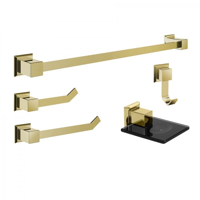 O kit de acessórios para banheiro da linha Gold representa o máximo em sofisticação ao seu banheiro. Tem formas retas e planas, cuja referência vem de linhas de design consagrado. O Acabamento Gold traz na sua essência sais de ouro 24K e isso se traduz em uma tonalidade requintada e luxuosa ao seu banheiro. Para você que é exigente e elegante, essa é a escolha perfeita! É produzido em metais de altíssima qualidade o que garante um produto de maior durabilidade.