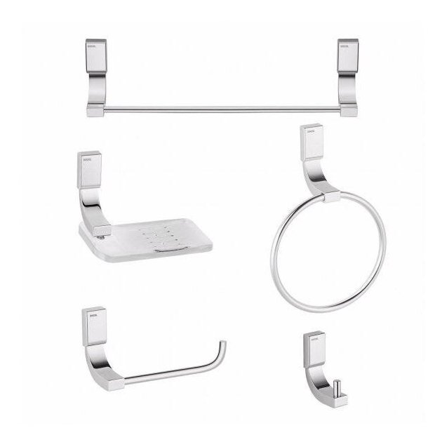 Feito em acabamento cromado e de alta resistência, o Kit Acessórios Docol Top Chrome contém um porta toalha argola, um porta toalha bastão, um cabide, uma papeleira e uma saboneteira.
