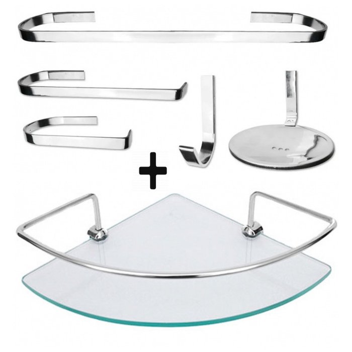 Kit Acessórios Para Banheiro Com Porta Shampoo Canto Parede Aço Inox e Vidro 6 Peças Slim
