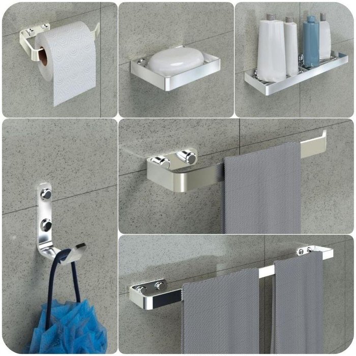 BENEFÍCIOSNão EnferrujaResistente a ÁguaAcabamento PremiumTampas de acabamento para esconder as cabeças dos parafusosFuros alinhados com parafusos sextavados, facilitando o acesso da ferramenta, tornando a instalação muito simples e rápidaGrades do porta Shampoo e Sabonete removíveis para facilitar a limpeza ESPECIFICAÇÕES TÉCNICASMaterial: Barra chata de Alumínio maciçoAcabamento: CromadoLargura da barra chata:16mmEspessura da barra chata: 4mmQuantidade de Peças do Kit: 06 Produzido em alumínio maciço com acabamento cromado de alta qualidade, não havendo problemas com ferrugem, com um design clean e sofisticado que irá valorizar o ambiente do seu banheir.Os parafusos do kit são pretos na mesma cor da peça dando um lindo acabamento. ITENS INCLUSOS01 UN - Porta Toalha de Rosto Cromado Plus01 UN - Porta Toalha De Banho Cromado Plus01 UN - Porta Papel Higiênico Cromado Plus01 UN - Cabide Cromado Plus01 UN - Porta Sabonete Cromado Plus01 UN - Porta Shampoo Cromado Plus MEDIDASGancho: Altura 6cm x Profundidade 5cm x Largura 1.6cmPorta Papel Higiênico: Altura 1.6cm x Profundidade 7cm x Largura 14cmPorta Toalha de Rosto: Altura 1.6cm x Profundidade 6cm x Largura 21cmPorta Toalha de Banho: Altura 1.6cm x Profundidade 6cm x Largura 44cmPorta Sabonete: Altura 1.6cm x Profundidade 8cm x Largura 10cmPorta Shampoo: Altura 1.6cm x Profundidade 8cm x Largura 24cm Todos os itens acompanham parafusos, buchas e tampas de acabamento para esconder a cabeça dos parafusos
