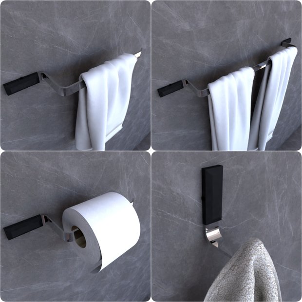 Para tornar seu Banheiro em um ambiente mais aconchegante utilizando itens de decoração que tornam a vida mais prática, é muito simples, a Linha de Acessórios Empire traz muita sofisticação com formas planas e retas. Produzido em Alumínio e Zamak com acabamento Cromado com um Alto Brilho garante maior durabilidade e resistência, não havendo problemas de ferrugem com o passar dos anos. Suas Canoplas de metais tem um acabamento de pintura eletrostática epóxi preta, trazendo um estilo próprio para a peça. BENEFÍCIOS: Não Enferruja Resistente a Água Acabamento Premium Canoplas de Metais Para Esconder os Parafusos de Fixação Furos alinhados com parafusos sextavados, facilitando o acesso da ferramenta, tornando a instalação muito simples e rápida. ESPECIFICAÇÕES TÉCNICA Área de aplicação: Banheiros e Lavabos Material: Alumínio e Zamack Acabamento: Cromado Cor: Prateado Alto Brilho Acabamento da Canopla: Pintura Eletrostática Epóxi Cor da Canopla: Preto Fosco Formato: Plano e Reto Sistema de Fixação: Parafusos Conteúdo da Embalagem: 1 Kit 4 Peças, Buchas, Parafusos e chave hexagonal Largura da barra chata:16mm Espessura da barra chata: 4mm MEDIDAS Largura x Altura x Profundidade Gancho: 2.2cm x 6.5cm x 5.5cm Porta Papel Higiênico: 20.5cm x 2.2cm x 7cm Porta Toalha de Rosto: 27cm x 2.2cm x 5.5cm Porta Toalha de Banho: 55cm x 2.2cm x 5.5cm ITENS INCLUSOS 01 UN - Porta Toalhas de Rosto Cromado 01 UN - Porta toalhas de Banho Cromado 01 UN - Porta Papel Higiênico Cromado 01 UN - Gancho Cromado