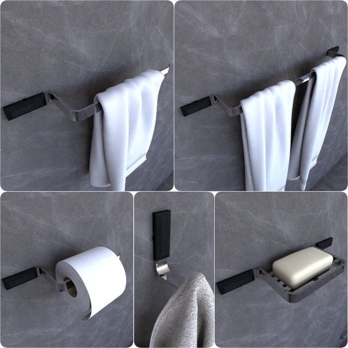 Kit Acessórios Para Banheiro Cromado e Preto Empire 5 peças Prateado
