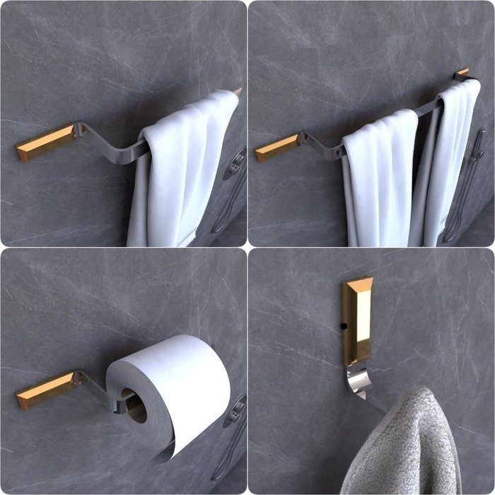 Para tornar seu Banheiro em um ambiente mais aconchegante utilizando itens de decoração que tornam a vida mais prática, é muito simples, a Linha de Acessórios Empire traz muita sofisticação com formas planas e retas. Produzido em Alumínio e Zamak com acabamento Cromado com um Alto Brilho garante maior durabilidade e resistência, não havendo problemas de ferrugem com o passar dos anos. Suas Canoplas de metais tem um acabamento Gold exclusivo, um banho de sais de ouro de 24k, que traz o brilho e tonalidade inigualável deste metal precioso. BENEFÍCIOS:Não EnferrujaResistente a ÁguaAcabamento Premium com Sais de Ouro de 24KCanoplas de Metais Para Esconder os Parafusos de FixaçãoFuros alinhados com parafusos sextavados, facilitando o acesso da ferramenta, tornando a instalação muito simples e rápida. ESPECIFICAÇÕES TÉCNICAÁrea de aplicação: Banheiros e LavabosMaterial: Alumínio e ZamackAcabamento: CromadoCor: Prateado Alto BrilhoAcabamento da Canopla: Banho de Sais de Ouro 24kCor da Canopla: Gold DouradoFormato: Plano e RetoSistema de Fixação: ParafusosConteúdo da Embalagem: 1 Kit 4 Peças, Buchas, Parafusos e chave hexagonalLargura da barra chata:16mmEspessura da barra chata: 4mm MEDIDASLargura x Altura x ProfundidadeGancho: 2.2cm x 6.5cm x 5.5cmPorta Papel Higiênico: 20.5cm x 2.2cm x 7cmPorta Toalha de Rosto: 27cm x 2.2cm x 5.5cmPorta Toalha de Banho: 55cm x 2.2cm x 5.5cm ITENS INCLUSOS01 UN - Porta Toalhas de Rosto Cromado01 UN - Porta toalhas de Banho Cromado01 UN - Porta Papel Higiênico Cromado01 UN - Gancho Cromado