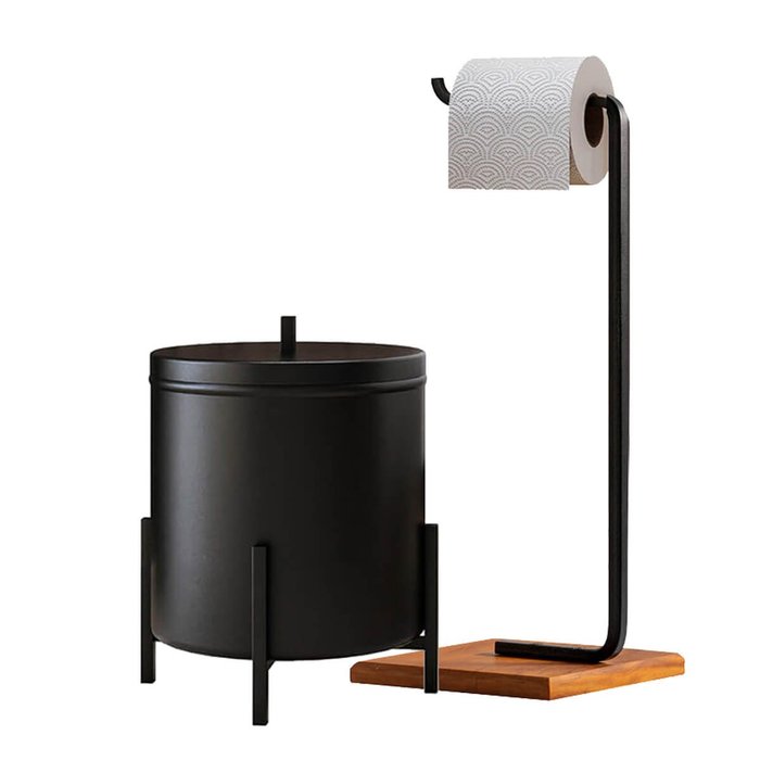 Kit Acessórios para Banheiro Lixeira e Suporte Porta Papel Higiênico Base de Madeira - ÉdeCasaMóveis Preto Fosco