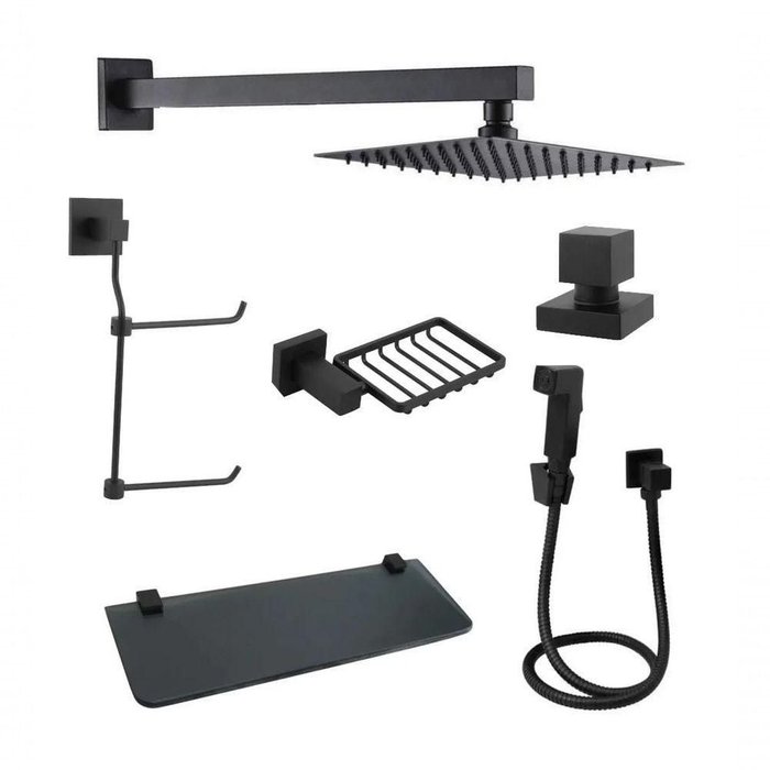 Esse kit é perfeito para você que procura praticidade e facilidade na hora de suas compras, o kit contém 6 peças que deixam o seu ambiente lindo e organizado, além disso traz sofisticação e elegância ao seu banheiro. O kit contém:1 Chuveiro Quadrado Slim Preto Fosco1 Ducha Quadrada Preta1 Acabamento para Registro Padrão Deca Preto Fosco Quadrado1 Papeleira Dupla Quadrada Preta1 Saboneteira Quadrada Luxo Preta Fosca1 Porta Shampoo com Vidro Fumê 30x10 com Acabamento Quadrado fosco ESPECIFICAÇÕES DE CADA PRODUTO: CHUVEIRO QUADRADO SLIM PRETO 20X20 Ducha articulável medindo 20cm x 20cm e braço de chuveiro quadrado de 30 cm, sendo a ducha fabricada em liga de cobre e o braço em alumínio ambos com acabamento feito por meio de pintura termofixa em Preto Fosco: durabilidade, resistência e conservação do acabamento por muito mais tempo. - Produto moderno com design slim (super fino) para um banheiro moderno e luxuoso.- Dutos de saída de água em silicone: evita entupimentos e possibilita maior facilidade na limpeza.- Base do chuveiro com pré-filtro: impede o acúmulo de detritos que possam vir a obstruir a saída de água.- Bitola de instalação: ½- Cabeça articulável. -Vazão: 15L/min por 10 m.c.a.- Polegada: 8 polegadas- Material: Inox 201- Pressão Mínima: 4 m.c.a.- Pressão Máxima: 32 m.c.a.itens inclusos:1 - ducha 20x20 preto1 - acabamento quadrado preto1 - cano 36cm preto ACABAMENTO PARA REGISTRO QUADRADO PRETO Acabamento para Registro Quadrado padrão Deca (16 estrias) Preto FoscoEscolha o melhor acabamento para registro para melhor decorar sua casa, trazendo elegância, sofisticação e o melhor de tudo qualidade.Proporcione o melhor para sua casa deixando seu ambiente mais lindo.O volante quadrado e a canopla são em metal.- Material: 100% Metal trazendo uma alta resistência- Acabamento: Design sofisticado e de alto padrão- Padrão da estria: Padrão Deca- Medidas disponíveis na foto Acompanha o Produto: 01 Volante Quadrado em Metal (Manopla).01 Canopla Quadrada em Metal (Base).01 Aperta canopla.(Preme Canopla)01 Parafuso Instalação (M5).01 Chave Allen Instalação (2,5mm) COMPATÍVEL COM:DECA, Sigma Metais, Furkin, Admo, Oriente Atual, Forusi, Bognar, Bometal, Stoc Metais, entre outros que seguem o mesmo padrão Deca.- Compatível com o padrão Deca;- Não serve para Docol e Fabrimar; PAPELEIRA OU PORTA PAPEL DUPLO PRETO QUADRADO Esse produto é excelente para você que procura dar beleza e sofisticação ao seu banheiro, além de trazer uma praticidade tem um design super moderno para decorar o seu banheiro da melhor forma.Com seu design Quadrado que está super em alta e seu modelo duplo na cor preto Fosco esse produto deixa seu ambiente muito mais elegante.Medidas disponíveis nas fotosA fixação é dupla para melhor aderência e segurança do produto na parede.O produto acompanha parafusos e buchas para fixação. SABONETEIRA QUADRADA PRETA Esse produto é excelente para você que procura dar beleza e sofisticação ao seu banheiro, além de trazer uma praticidade tem um design super moderno para decorar o seu banheiro da melhor forma.Com seu design Quadrado que está super em alta e seu modelo na cor Preto Fosco esse produto deixa seu ambiente muito mais elegante.- Acabamento Preto Fosco de alta resistência à corrosão, conservando a beleza do produto por muito mais tempo.MEDIDAS12.X8CMITENS INCLUSOS;1 Saboneteira1 Kit para Instalação Ducha Higiênica completa quadradaDucha toda em preto comunicando sofisticação, luxo e glamour para seu banheiro. Porque os detalhes fazem toda diferença.